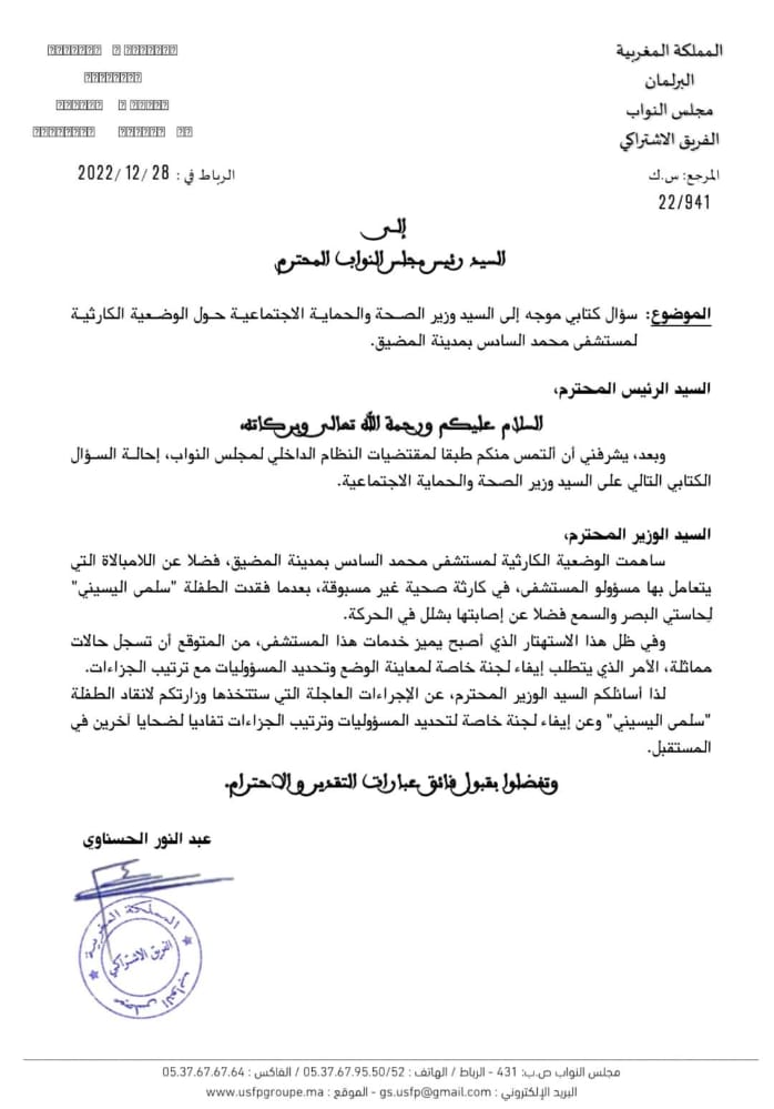 الحسناوي يسائل أيت الطالب بسبب فقدان طفلة لحاستي السمع والبصر اثناء عملية جراحية