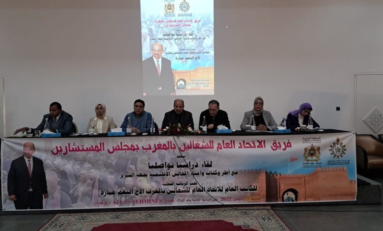 في إطار سلسلة اللقاءات التواصلية المفتوحة التي ينظمها فريق الاتحاد العام للشغالين بالمغرب بمجلس المستشارين خلال هذه الولاية التشريعية مع الاطر وممثلي المكاتب الجهوية والاقليمية النقابية على الصعيد الوطني؛ عقد الفريق يوما دراسيا وتواصليا يوم امس السبت 24 دجنبر 2022 مع مع أطر وكتاب وأمناء المجالس الإقليمية بجهة الشرق، وذلك بفندق ATLAS TERMINUS – بوجدة تحت الرئاسة الفعلية للكاتب العام للاتحاد العام للشغالين بالمغرب السيد “النعم ميارة” بحضور رئيس واعضاء الفريق وبعض القيادات النقابية ل UGTM وحزب الإستقلال بالجهة الشرقية.