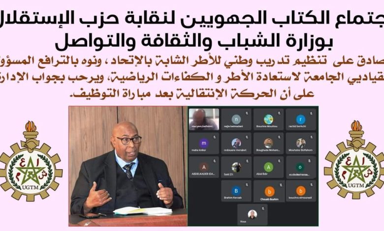 عقدت نقابة الإتحاد العام للشغالين بوزارة الشباب والثقافة والتواصل والموالية لحزب الإستقلال مساء يوم الثلاثاء 03 يناير 2023 اجتماعا عن بعد ، شارك فيه الكتاب الجهويون للنقابة بقطاع الشباب، وقد ترأس هذا الاجتماع الأول من نوعه خلال سنة 2023 أحمد بلفاطمي الكاتب الوطني للاتحاد. وفي كلمته الإفتتاحية هنأ بلفاطمي الكتاب الجهويين بحلول السنة الميلادية الجديدة، كما نوه بالجهود و الانخراط الجاد الذي أبان عنه مناضلو الجامعة الوطنية العاملين بالجهة الشرقية و مساهمتهم في إنجاح اللقاء التواصلي الذي ترأسه الأخ النعم الميارة الكاتب العام للاتحاد العام للشغالين بالمغرب.