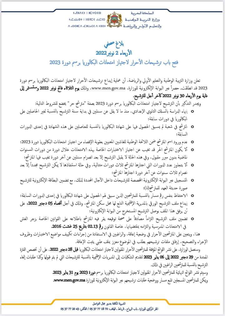 أعلنت وزارة التربية الوطنية والتعليم الأولي والرياضة، أن عملية إيداع ترشيحات الأحرار لاجتياز امتحانات البكالوريا برسم دورة 2023 قد انطلقت حصراً عبر البوابة الإلكترونية للوزارة، www.men.gov.ma، وذلك من يوم الثلاثاء فاتح نونبر 2022 إلى غاية يوم الأربعاء 30 نونبر 2022 كآخر أجل للترشيح.