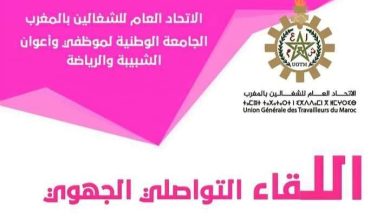 نيوتيفي-عزالدين بلبلاج في إطار الإستعداد لعقد المؤتمر الوطني؛ وتماشيا مع مخرجات الإجتماعات التحضيرية للجان المختلفة التي تسهر على الحفاظ على السير العام لهذا الحدث التنظيمي؛ ووفق التوجهات العامة للاتحاد العام للشغالين بالمغرب؛ تنظم الجامعة الوطنية لموظفي واعوان الشبيبة والرياضية لقاءا تواصليا مع المناضلات والمناضلين بجهة الداخلة واد الذهب، تحت شعار “نضال…